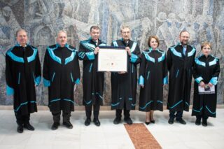 Orhan Pamuk, alături de reprezentanţii comunităţii academice a UVT, după decernarea titlului de DHC. Foto UVT