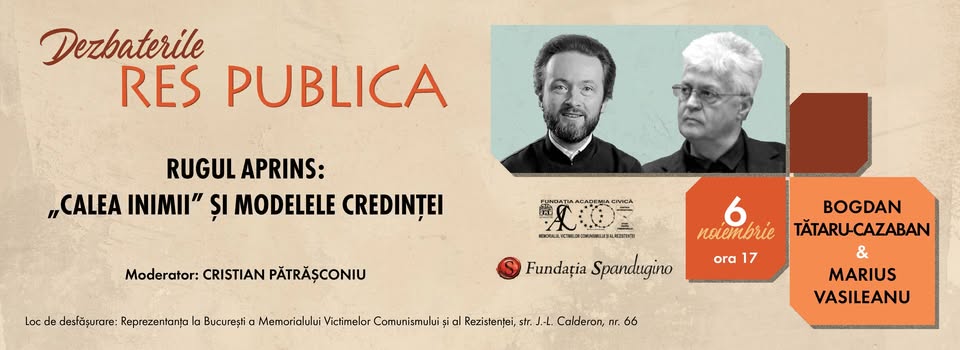 Fundația Academia Civică – Memorialul Victimelor Comunismului și al Rezistenței și Fundația Spandugino organizează un nou eveniment în cadrul seriei dezbaterilor Res Publica. Invitaţi sunt Bogdan Tătaru-Cazaban şi Marius Vasileanu, care vor intra într-un dialog pe tema “Rugul aprins: «Calea inimii» şi modelele credinţei”. Moderatorul dezbaterii este Cristian Pătrăşconiu.